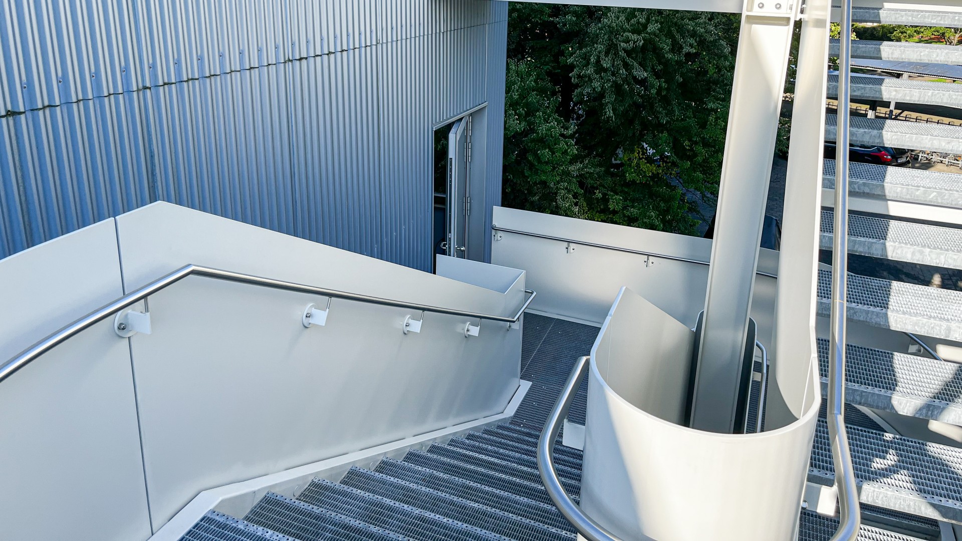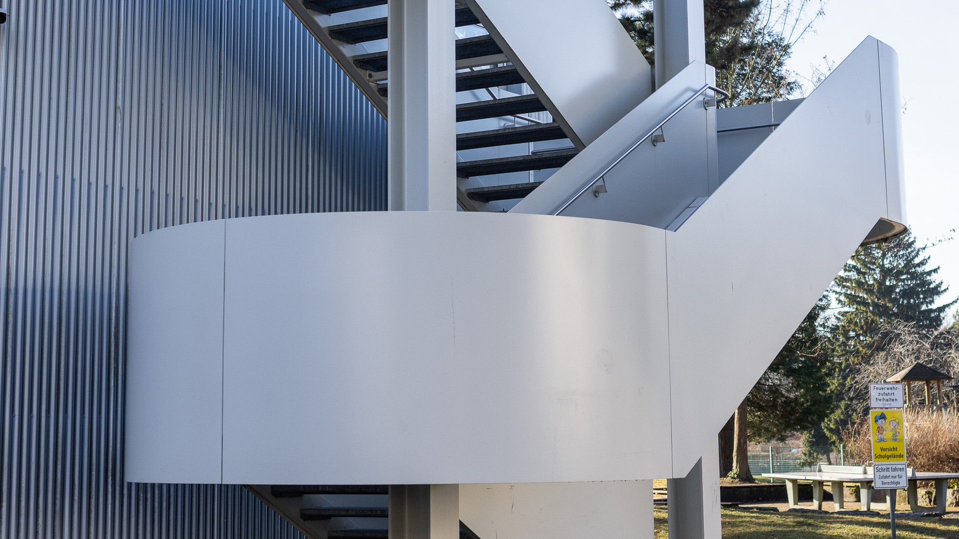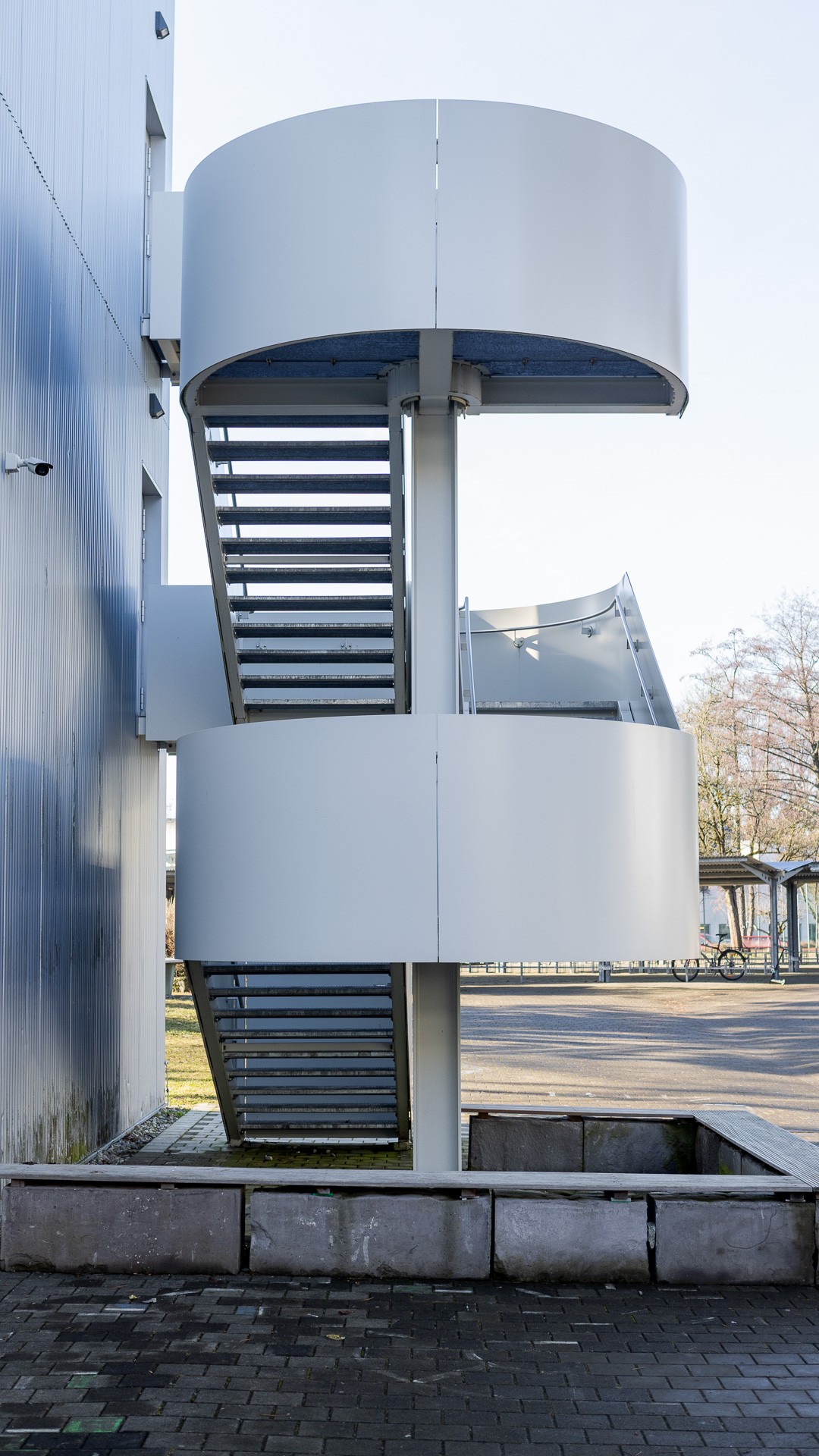 Im Innenbereich werden die bestehenden Geländer erhöht und mit einem Edelstahlhandlauf ausgestattet. Durch Stahltreppen wird im Aussenbereich auf der Süd- und Westseite jeweils ein zweiter Fluchtweg geschaffen. Für die Treppe am "Rundbau" aus dem Jahr 1997 haben sich die Planer eine besondere Konstruktion überlegt.