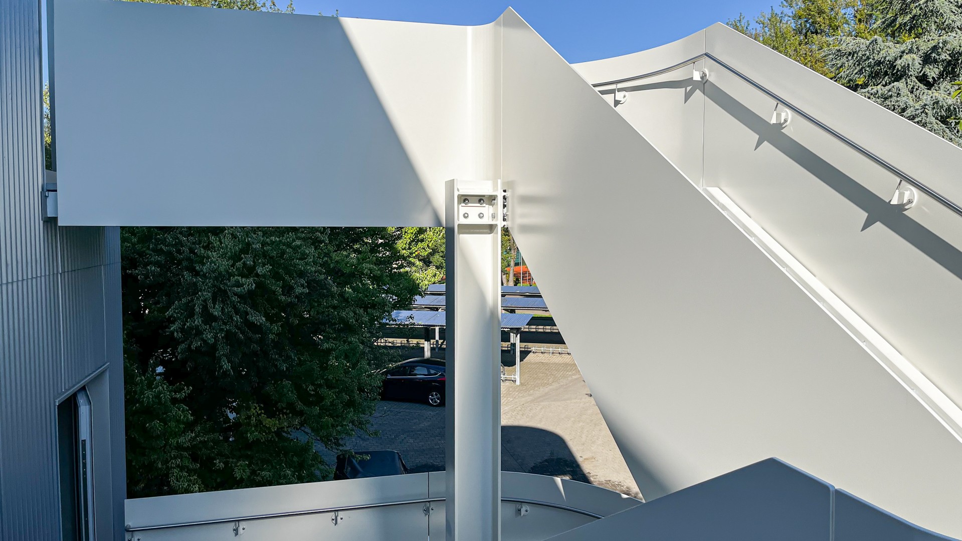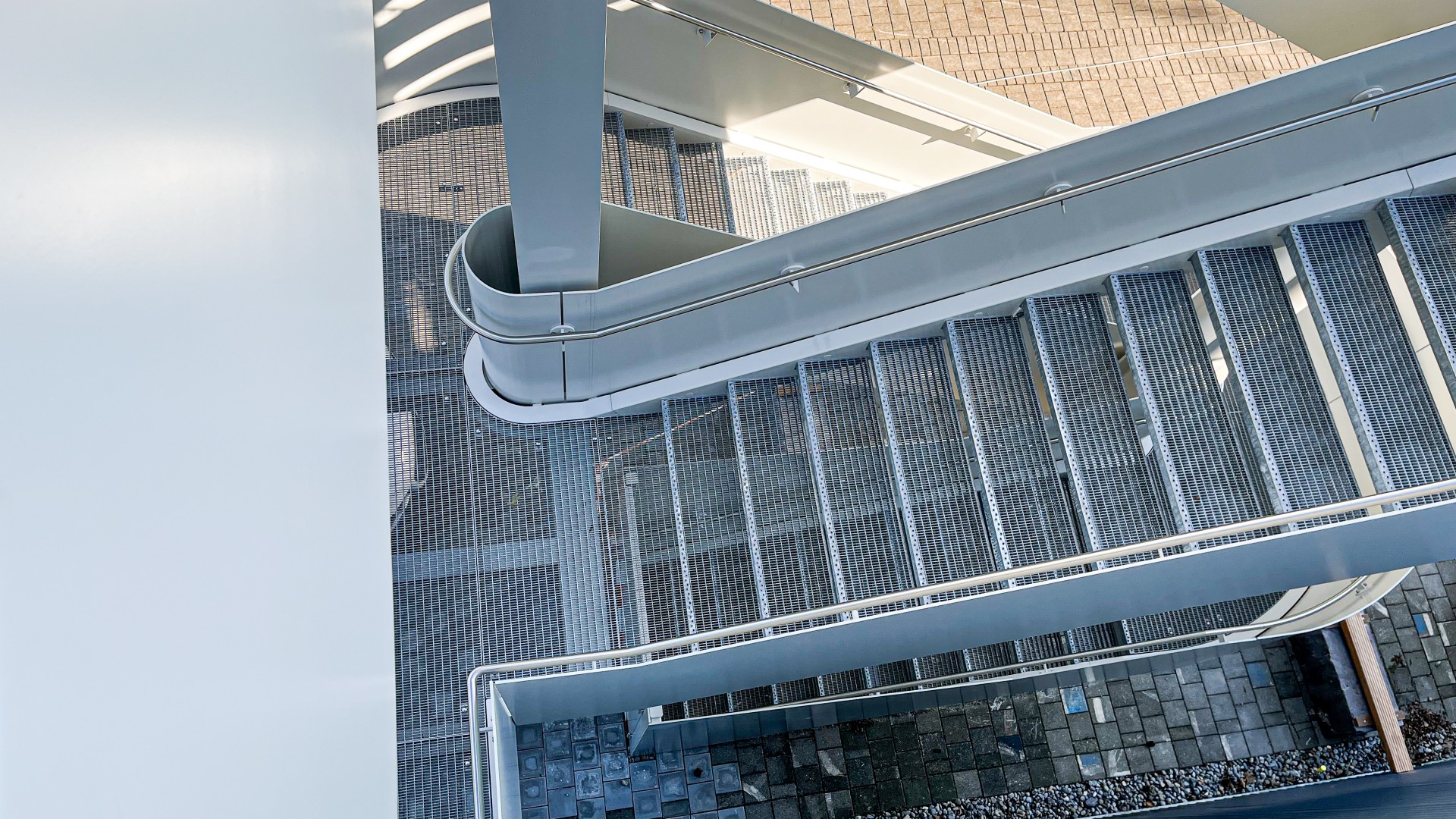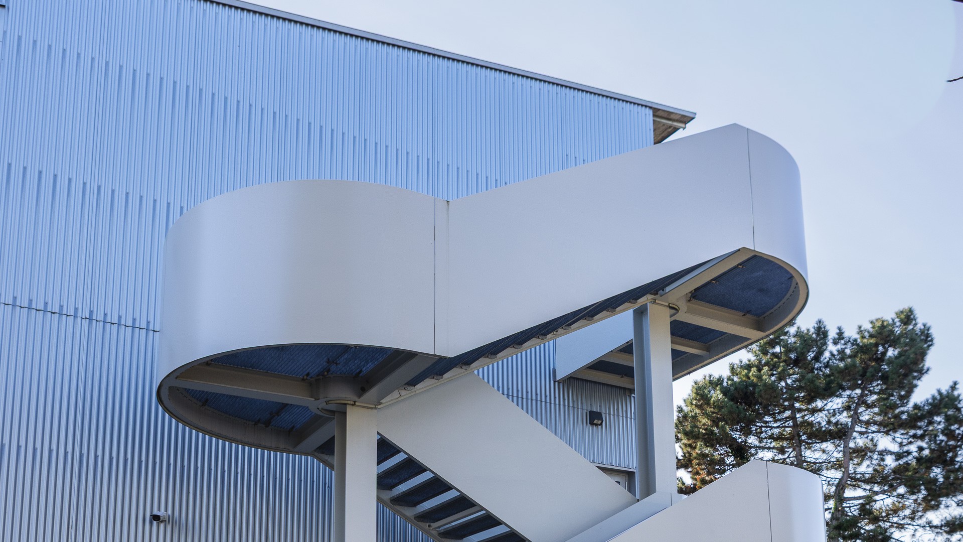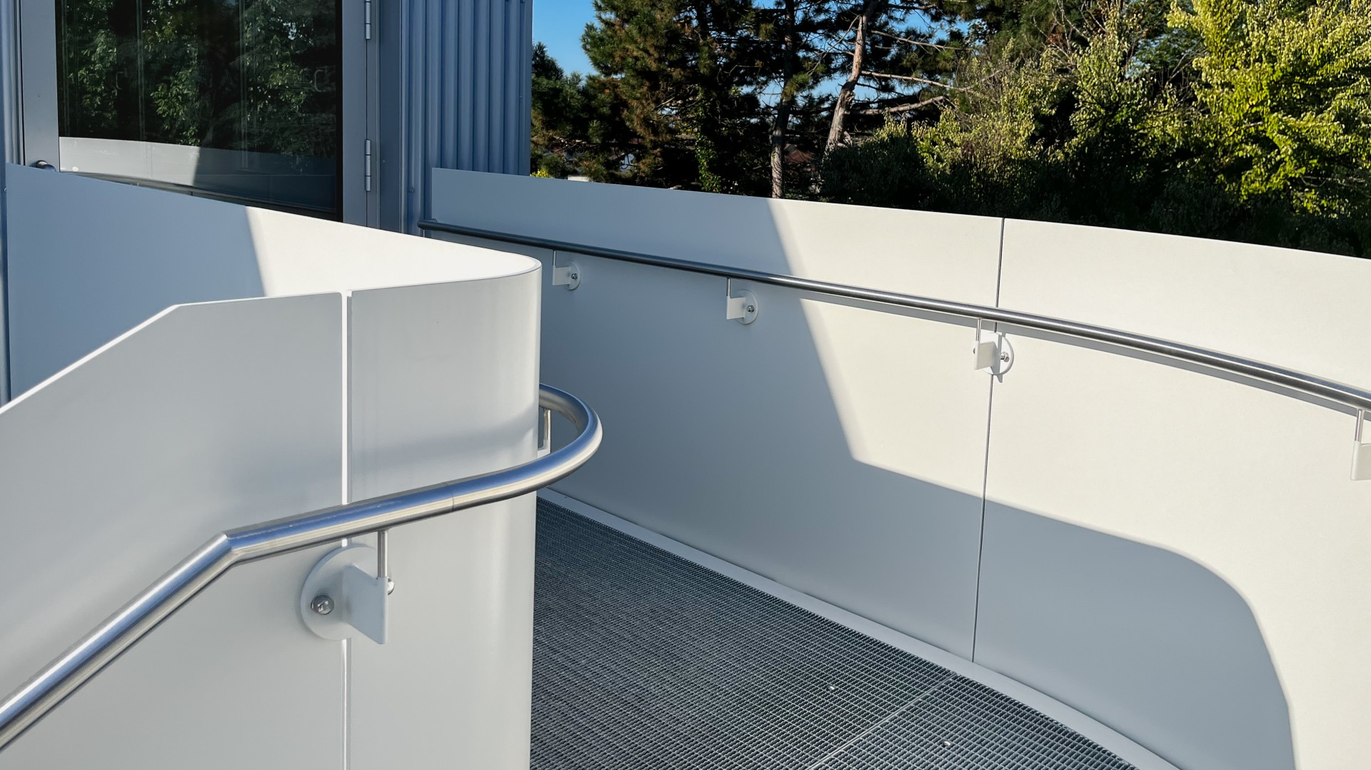 Im Innenbereich werden die bestehenden Geländer erhöht und mit einem Edelstahlhandlauf ausgestattet. Durch Stahltreppen wird im Aussenbereich auf der Süd- und Westseite jeweils ein zweiter Fluchtweg geschaffen. Für die Treppe am "Rundbau" aus dem Jahr 1997 haben sich die Planer eine besondere Konstruktion überlegt.