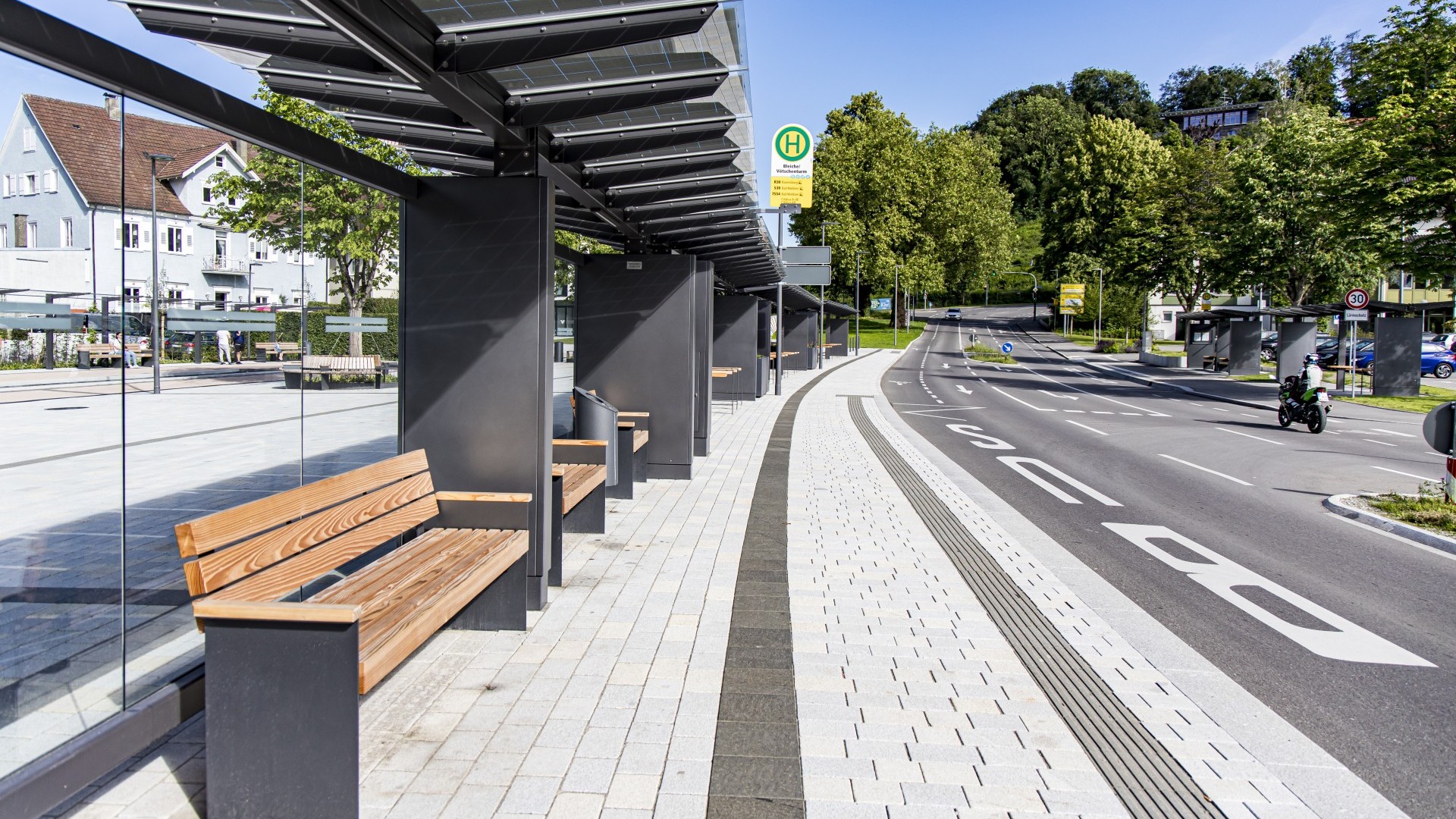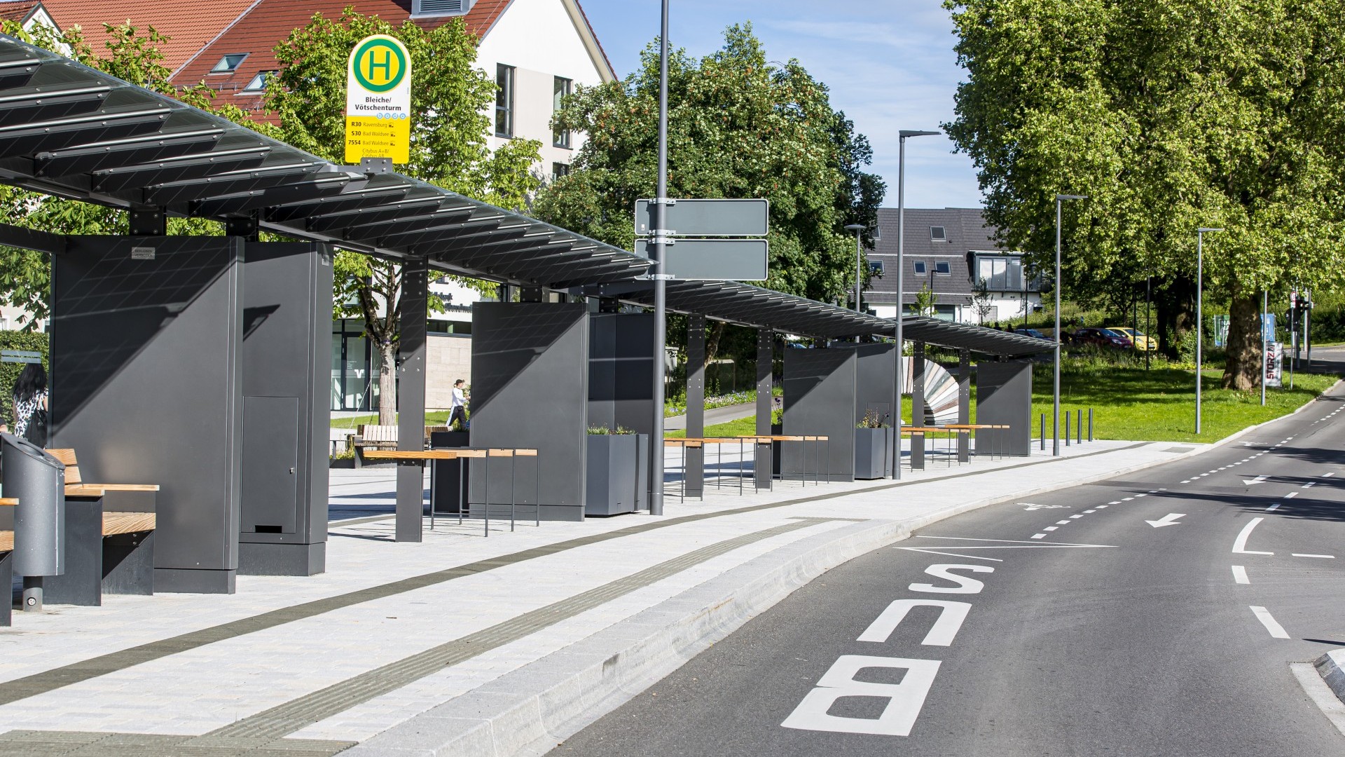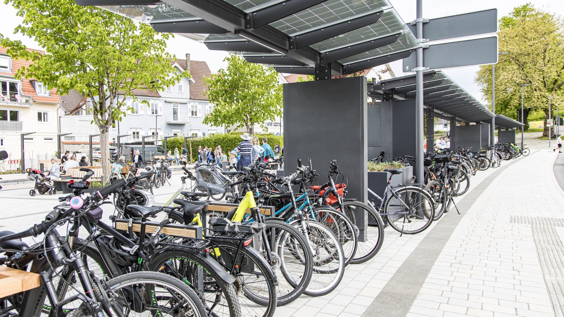 Hier wurden mehrere Fahrradüberdachungen, Bushaltestellen, E-Bike Ladestationen, Schließfächer, Pergolen und vieles weitere mehr von uns installiert. Durch die integrierte PV-Anlage in der Bedachung sowie die E-Bike Ladestation wurde auch aktuellen Themen wie Nachhaltigkeit und umweltfreundliche Mobilität seitens der Stadt Bad Waldsee entsprechend Rechnung getragen.