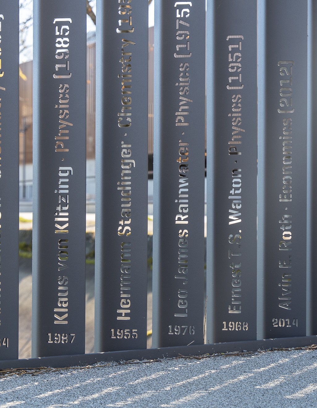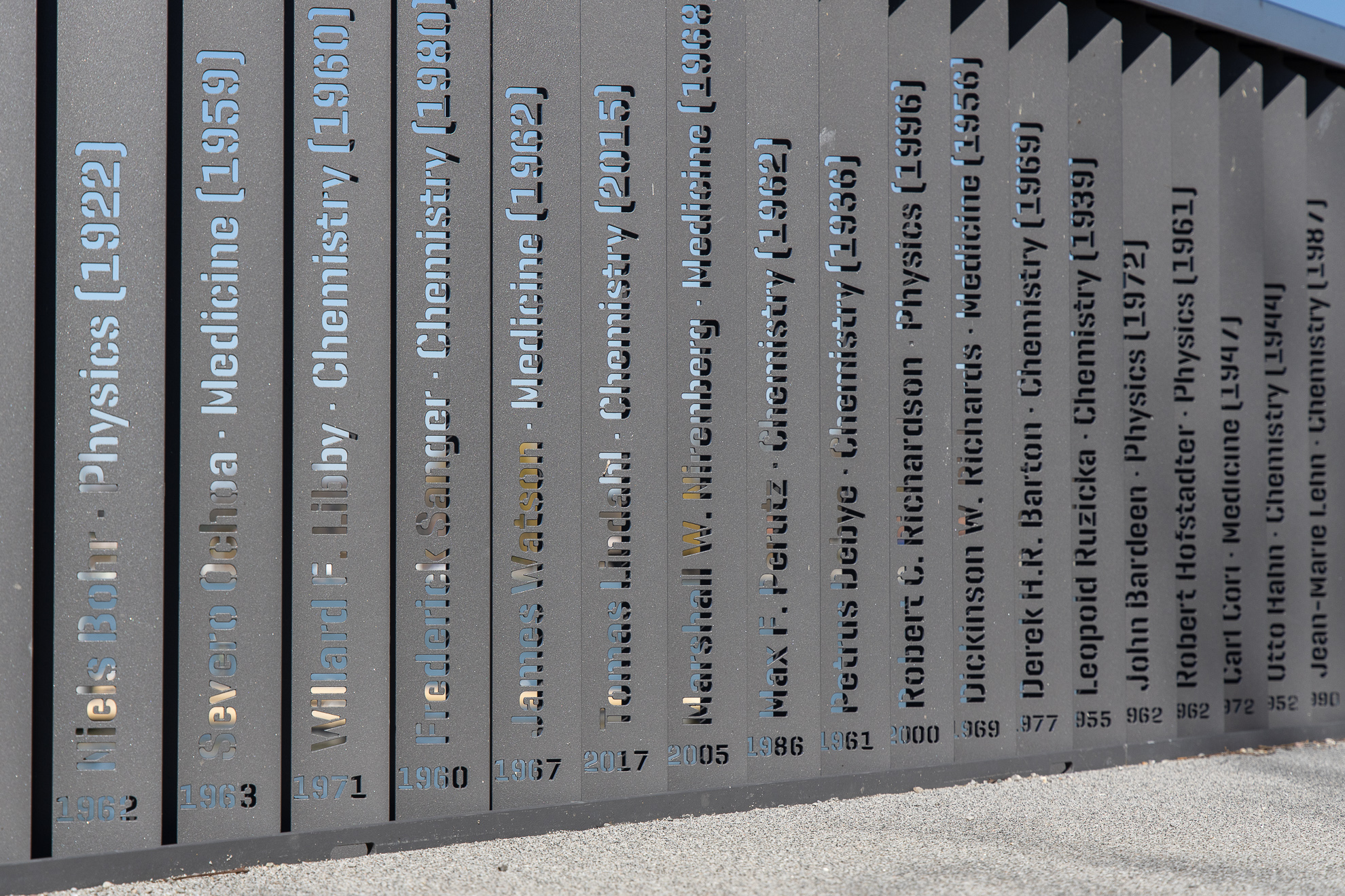 Die Preisträger sollen symbolisch versammelt und namentlich erwähnt werden. Eine Ehrung der Preisträger erfolgt durch eine in die Staketen gelaserte Nennung des Namens, der wissenschaftlichen Disziplin sowie des Jahres der Verleihung des Nobelpreises und des ersten Besuches einer Tagung in Lindau. Von den insgesamt ca. 1100 Staketen treten bis dato über 400 Stück mit Namen der Nobelpreisträger hervor. Der Schriftzug wurde mittels Laser in die jeweiligen Elemente geschnitten. Zukünftige Besuche von weiteren Nobelpreisträgern werden dann ebenfalls in den Staketen gewürdigt und am Lindauer Nobelpreisträger-Steg verewigt.